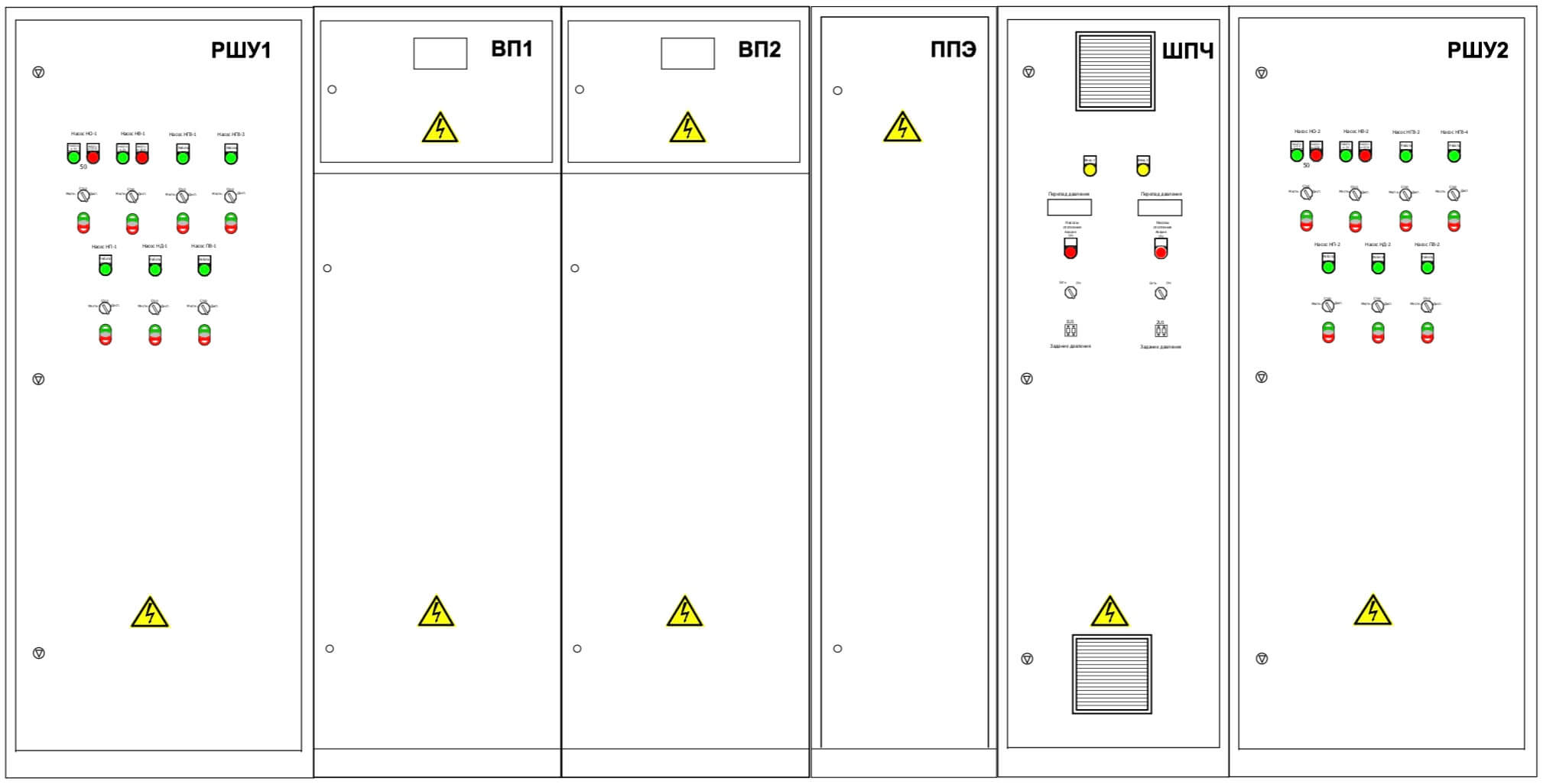 - вводные шины — обеспечивают приём электроэнергии от вводных шкафов типа ВРУ‑ВП (ВП1 и ВП2), формируя непрерывную цепь электроснабжения;